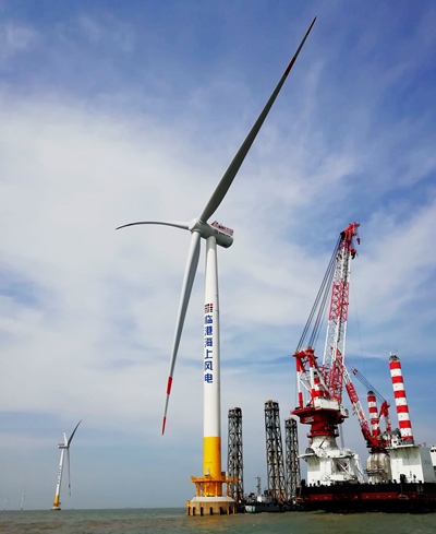 5月9日,上海临港海上风电一期示范项目首台风电机组成功完成吊装,该机组为上海电气6.25-172海上风机,是全球已吊装的叶轮直径最大的海上风机。此机组叶片由中复连众制造,单只叶片长84米,功率6.25兆瓦,是全球最长玻纤增强叶片。