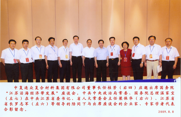 8月8日,中共中央政治局常委、国务院总理温家宝在江苏考察调研,并召开国务院“江苏沿海经济带发展”座谈会,就江苏沿海地区的经济发展广泛听取了连云港、盐城、南通部分重点企业负责人和专家的意见。中国复合材料集团有限公司副总经理、连云港中复连众复合材料集团有限公司董事长任桂芳作为重点企业家代表应邀出席,并合影留念。
