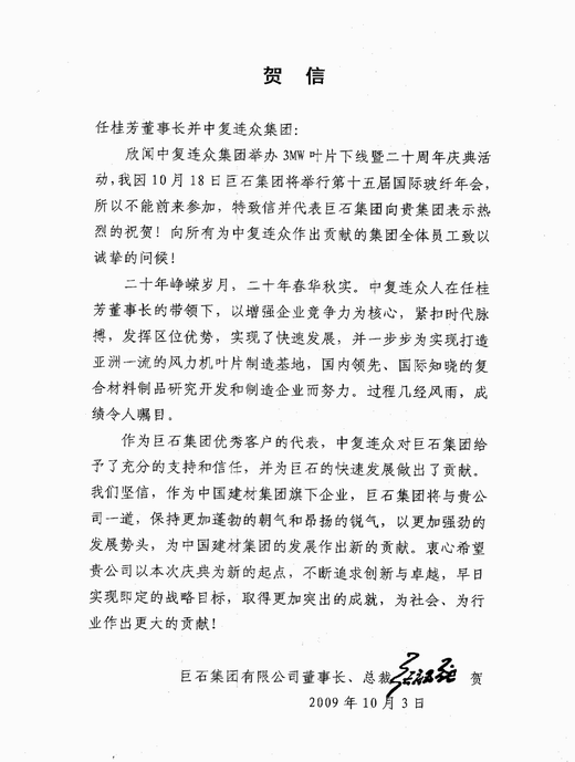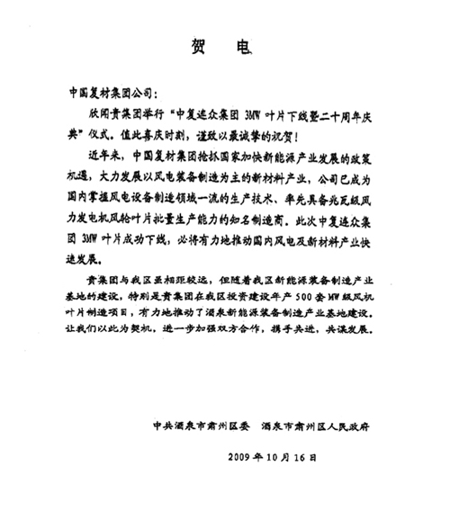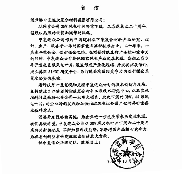 金秋十月,恰逢中复连众3.0MW风力机叶片暨二十周年。近日来,江苏省科技厅、甘肃酒泉肃州区委区政府、巨石集团等单位发来贺信,对中复连众表示祝贺。