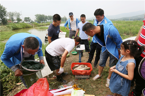 尽管烈日当空,仍无法阻挡钓鱼发烧友的热情,大家早早地在鱼塘边支起了遮阳伞,拿出了自己的装备,在水边悠然开始钓鱼。时间静静流过,全场钓友们紧绷着每一根神经,随着一声轻呼,我们的第一个幸运儿产生,拉起了一条肥美的鱼儿;大家无一不为其鼓掌致贺,同时内心也被激起一股胜负欲,摩拳擦掌、跃跃欲试。突然,爆发一声声惊呼,引来大家的围观,原来是叶片一二分厂的张志强钓到了约半米长的大鱼,一上称净重7.5斤,拔得了今天的“鱼王”头筹;“一丈青竹一丈线,一点猩红碧水间。”之后赛场间或引发阵阵呼声,每一位钓友都收获颇丰。