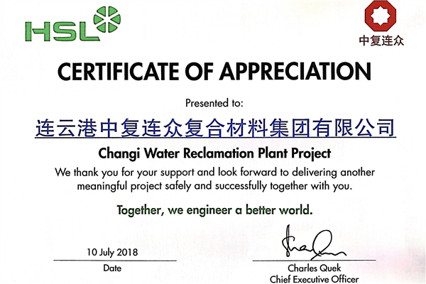 2018年7月9-11日,新加坡水处理博览会在金沙国际会展中心举行。展会上,HSL公司CEO Charles Quek先生向中复连众总经理助理、管道公司经理杨泽平颁发了感谢证书,对中复连众在新加坡大型污水处理厂项目中的优异表现表示感谢。同时,HSL公司和中复连众签订了长期合作备忘录,双方将进一步开展深度合作。