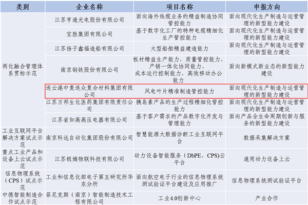 2018年8月10日,工信部公布了《2018年制造业与互联网融合发展试点示范项目名单》,项目总计立项125个,江苏省11个项目入围。其中,中复连众所申报的“风电叶片精益制造管控能力” 项目成功入选两化融合管理体系贯标示范项目。